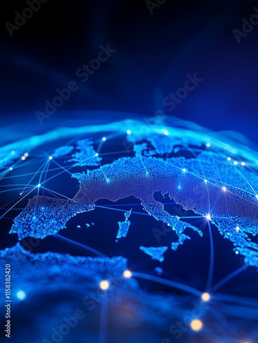 Global Digital Network Map with Illuminated Data Connections Across Continents