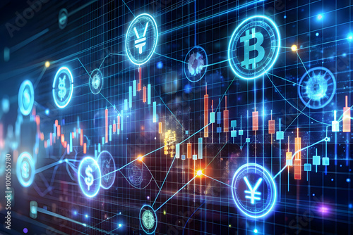 Global Finance Network: A futuristic digital visualization of global finance, showcasing various currency symbols, stock market charts, and interconnected nodes.