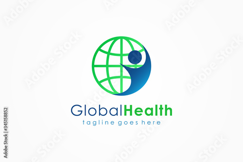 Global Health People Logo. World Globe Icon with People Symbol Combination. Usable for Business, Sport, Technology and Healthcare Medical Logos. Flat Vector Logo Design Template Elements.
