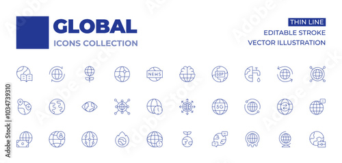 Global icons collection. Thin Line icons, editable stroke. big data, chat, eye, global, earth, earth day, money, telecommuting, time zone, world, global network, global warming