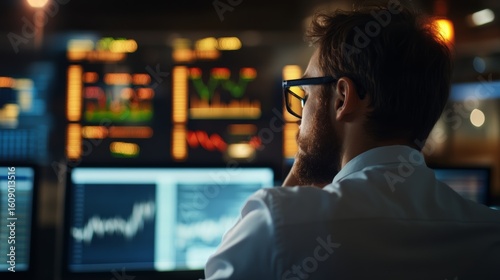 global investor in control room with global economic data,
