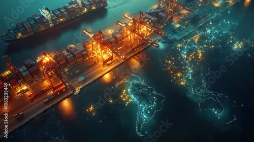 Global Logistic Network Distribution and Cargo Ships Delivering Containers at a Port during Night - International Delivery Concept with World Map and Illuminated