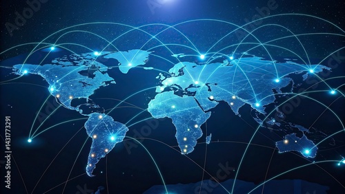 Global network connection over the world. Internet Concept of global business.World map with glowing lines on dark background. Network and communication concept. 3D Rendering