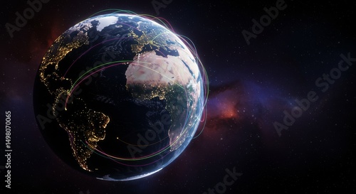 Global Network Connections - Stunning of Earth at night, showcasing illuminated cities and glowing lines representing global interconnectedness