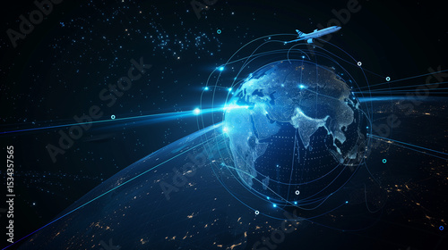 global network, digital globe, airplane, flight path, futuristic world map, data visualization, air travel, global connection, aviation technology, glowing earth, connected world, flight route, intern