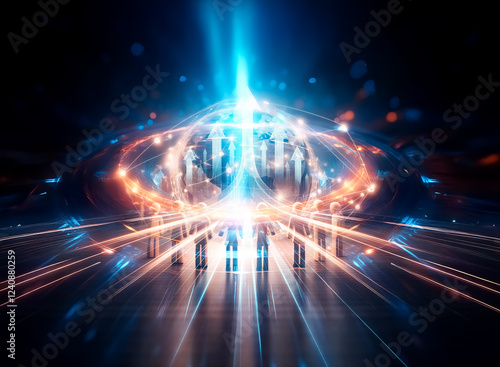 Global network, illuminated Earth encircled by interconnected figures symbolizing unity, collaboration, and worldwide communication. A scene of global connectivity and togetherness.
