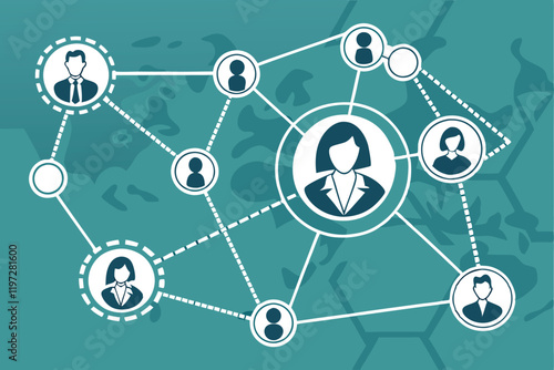 Global network, interconnected people icons, world map background, teal color scheme, hexagonal pattern, diverse avatars, social connectivity visualization, business networking concept, digital commun