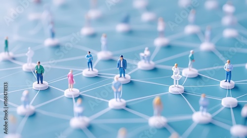 Global Network: Miniature figures interconnected on a vibrant blue background, symbolizing global connections, networking, and community.