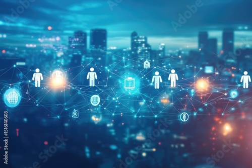 Global network of connected people, symbolized by digital icons and a city skyline