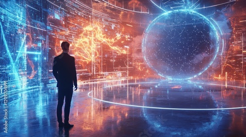 Global Network Visualization: A businessman observes a futuristic holographic display of interconnected data streams and a glowing digital Earth