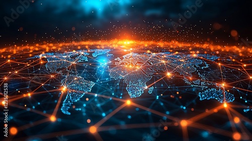 Global network visualization with glowing connections over a digital world map at dusk