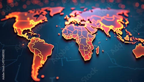 Global supply chain map visualization. Complex network of transportation routes, distribution centers. World map connections, trade flow. Futuristic, modern concept. No people. Focus on logistics,