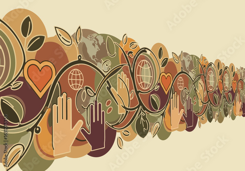 Global unity with diverse hands reaching out, hearts embracing nature, and the earth uniting humanity in a vibrant abstract design.