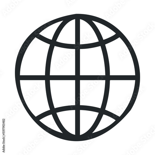 Global web icon in black and white with grid lines and continents