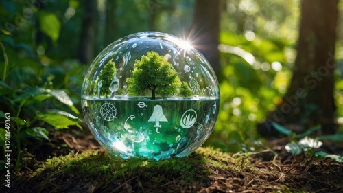 Globe Glass with save water icons In Green Forest With Sunlight. water day. clean renewable energy, Environmental protection concept of protecting the earth's water resources
