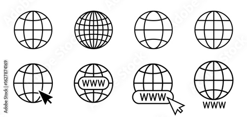 Globe icon set. Search bar. Search bar vector icons in flat design. Website Icon. World icon. Www icons with cursor. Vector www icon.
