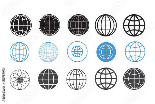 Globe Icons Set with Grid Patterns and Flat Earth Silhouette Vector Collection