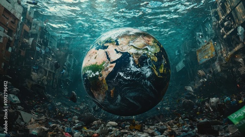 globe in the ocean at the bottom. Selective focus