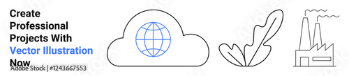Globe inside cloud, leaf symbolizing nature, factory with smokestacks in linear graphics. Ideal for sustainability, industry, technology, eco-friendly themes, digital, cloud storage flat landing