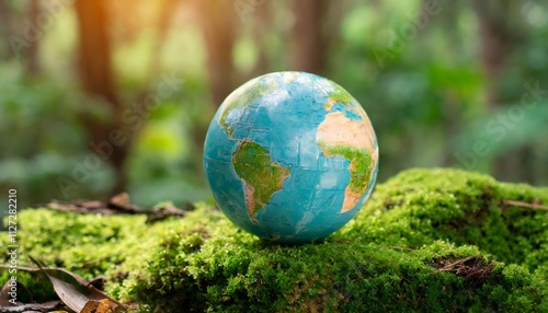 Globe on Moss in Forest A Symbol of Environmental Awareness and Earth Day Celebration, Emphasizing the Beauty of Our Green Planet and the Importance of Protecting Nature for Future Generations