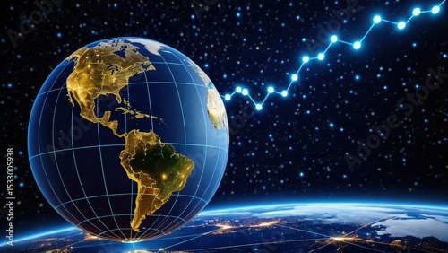 Globe with real-time glowing data streams (GDP, trade, growth %) connecting continents, upward graphs, deep space backdrop, growth, financial, business.
