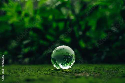 Globeglass in green grass forest with sunlight. Environment, save the earth, earth day and conservation.