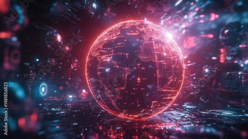 Globes, data, futuristic world. Digital representation of the Earth within a network of data streams. Intense glowing red and blue colors create a dynamic, futuristic feel