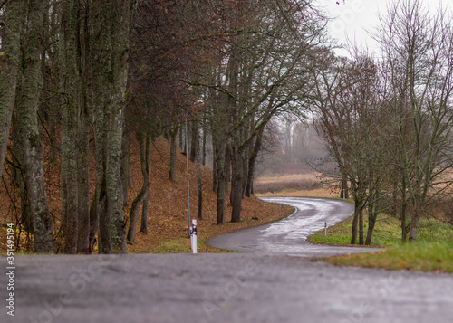 gloomy autumn landscape with wet road, large bare trees by the roadside, autumn