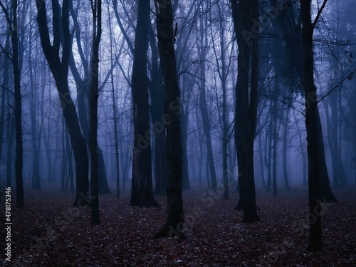 Gloomy dark forest at dusk. Mysterious autumn forest in blue colors. Twilight in the woods. Spooky place.