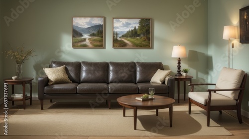 Gloomy dull rocker with wooden coffee table, orchid and depict near green divider. Creative resource, AI Generated