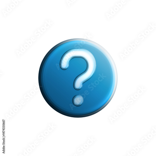 Glossy blue button with a bold white question mark symbol, rendered in a 3D style on transparent background. For FAQ sections, help center icons, customer support.