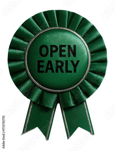 Glossy green ribbon badge with OPEN EARLY promotion in bold text, attention-grabbing retail offer on transparent background.