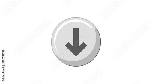 Glossy grey circular button with a dark downward arrow symbol, isolated on white, for digital interface, download, or direction