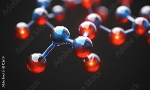 Glossy molecular model with interconnected spherical atoms in blue and red hues against a dark background, symbolizing chemical bonds and scientific research
