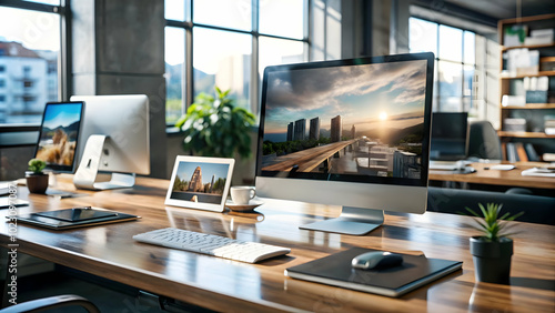 Glossy Office Environment: Marketing Materials Neatly Arranged on Desk - Professional and Polished Workspace Concepts for Photo Stock