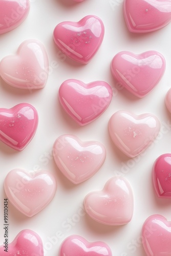 Glossy, pink candy-like hearts with a smooth finish and delicate shine arranged on a white surface