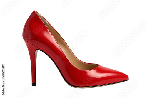 Glossy red stiletto heel shoe side view isolated on a transparent background image