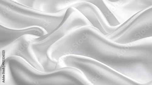 Glossy white fabric with freeform curves, creating a flowing, reflective wave pattern, soft focus and elegant sheen.