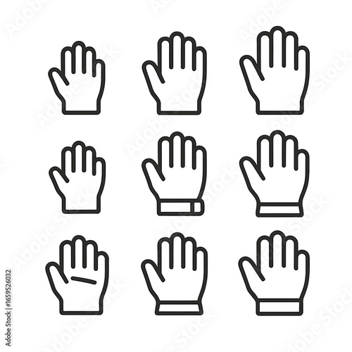 Glove Sizes Icon Set. Outline icon set of gloves sizes: small, medium, large, extra-large, kid’s size, adjustable wrist,