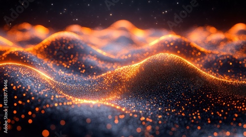 Glowing Abstract Landscape: A digital artwork showcasing a mesmerizing terrain of fiery particles, undulating hills, and a dark, starry backdrop. The image evokes a sense of wonder and mystery.
