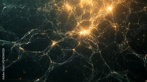 Glowing abstract neural connections resembling a golden cosmic web, representing data transmission, artificial intelligence, and digital communication