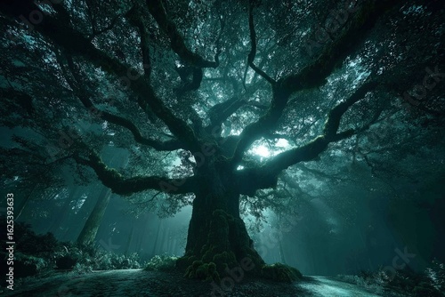 Glowing Ancient Pixelated Tree In Dark Forest