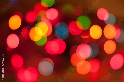 Glowing and festive colored light circles created from in camera and lens bokeh. Christmas fairy lights defocused giving a blurred effect. Background for design.