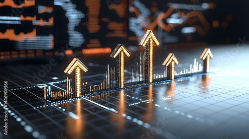 Glowing arrows representing upward financial trends and market growth data visualized through dynamic digital charts and graphs