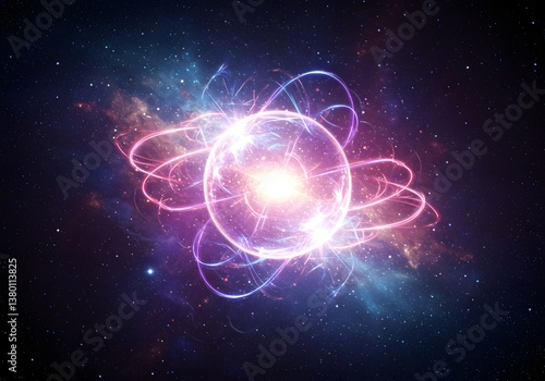 Glowing atom illustration, energy sphere, orbital motion, concept of science, physics, galaxy, cosmos, particles in space, abstract background.