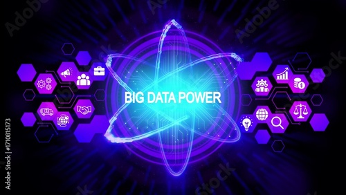 Glowing atom nucleus with text B I G D A T A P O W E R surrounded by purple hexagons and business icons