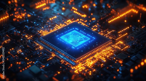 Glowing Blue And Orange Circuit Board With Central Processor With Central Processor System Components Circuitry Board Displayed By Computer Engineering Experts During Technical Demo For Presentation