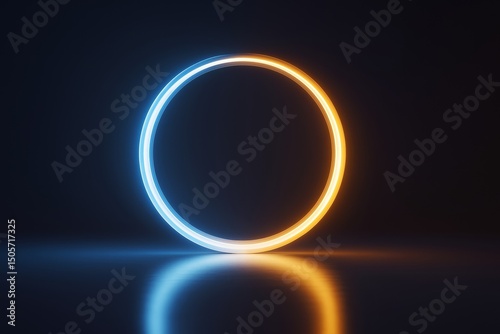 Glowing blue and orange neon circle on dark reflective background with blank space for design, branding, or advertising concept mockup template.