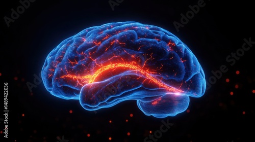 Glowing blue and red neural pathways inside a human brain hologram on a dark background illustrating brain activity and connectivity
