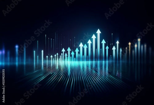 Glowing blue arrows point upwards, representing growth, on a dark blue background with lines radiating from the center.